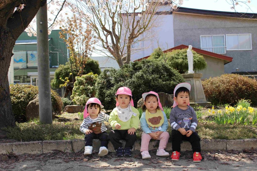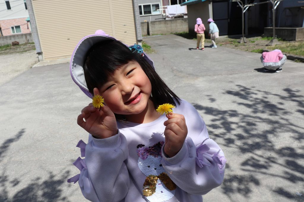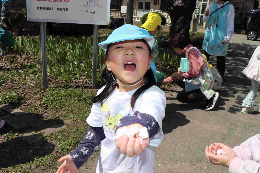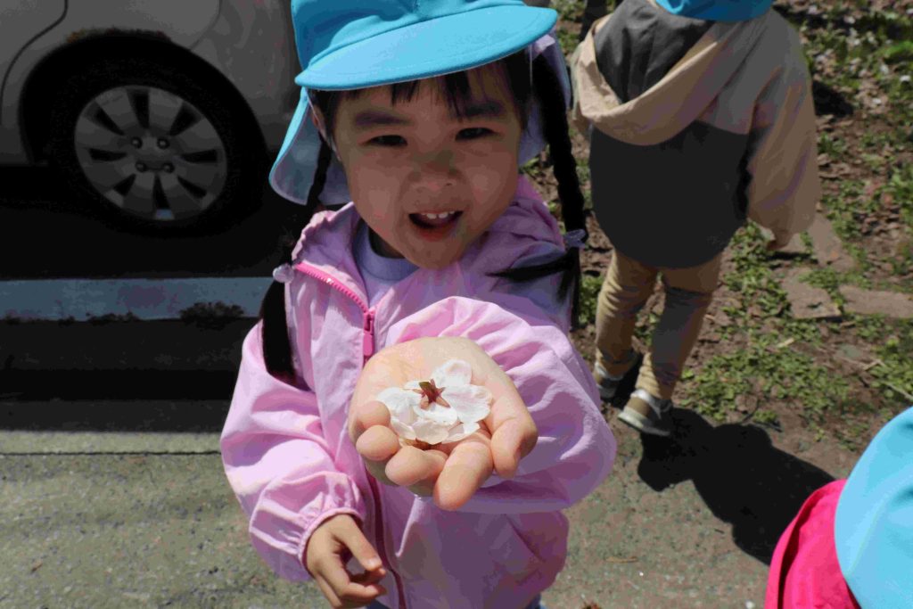 落ちている桜の花を拾ったり、たんぽぽを摘んだり、