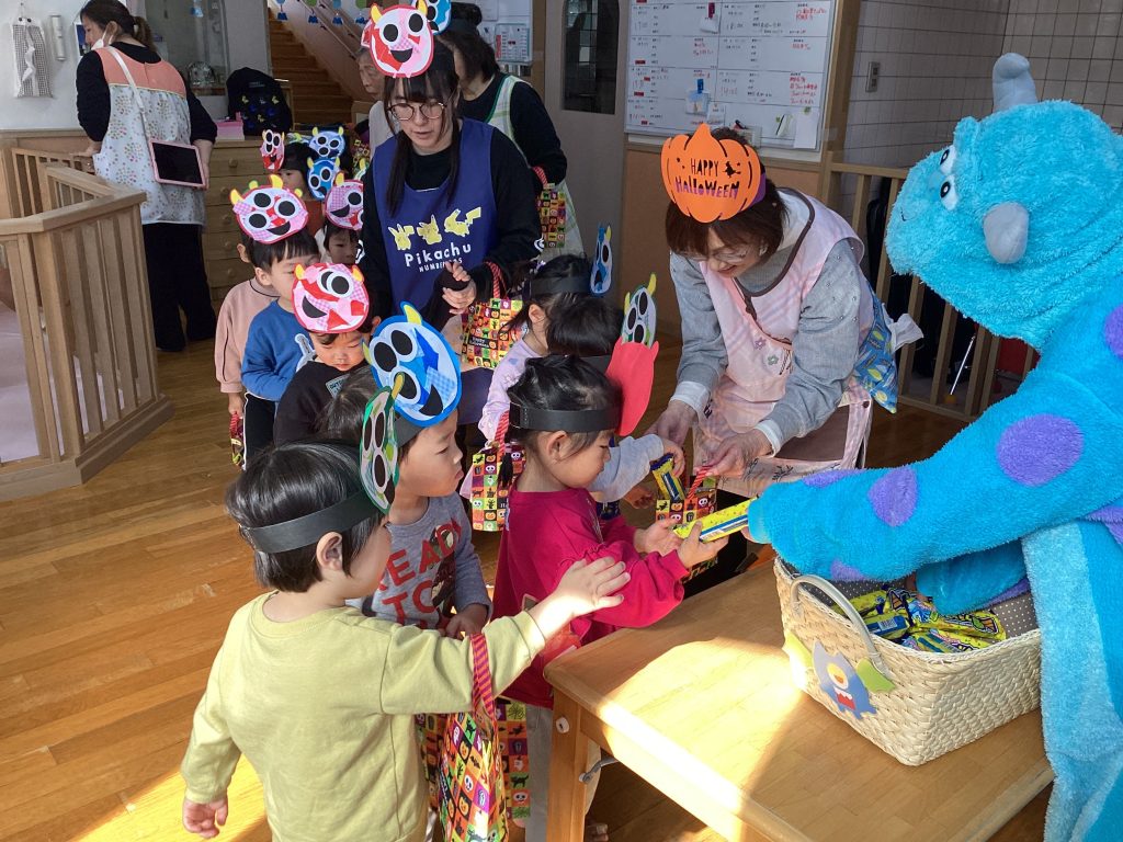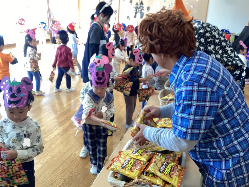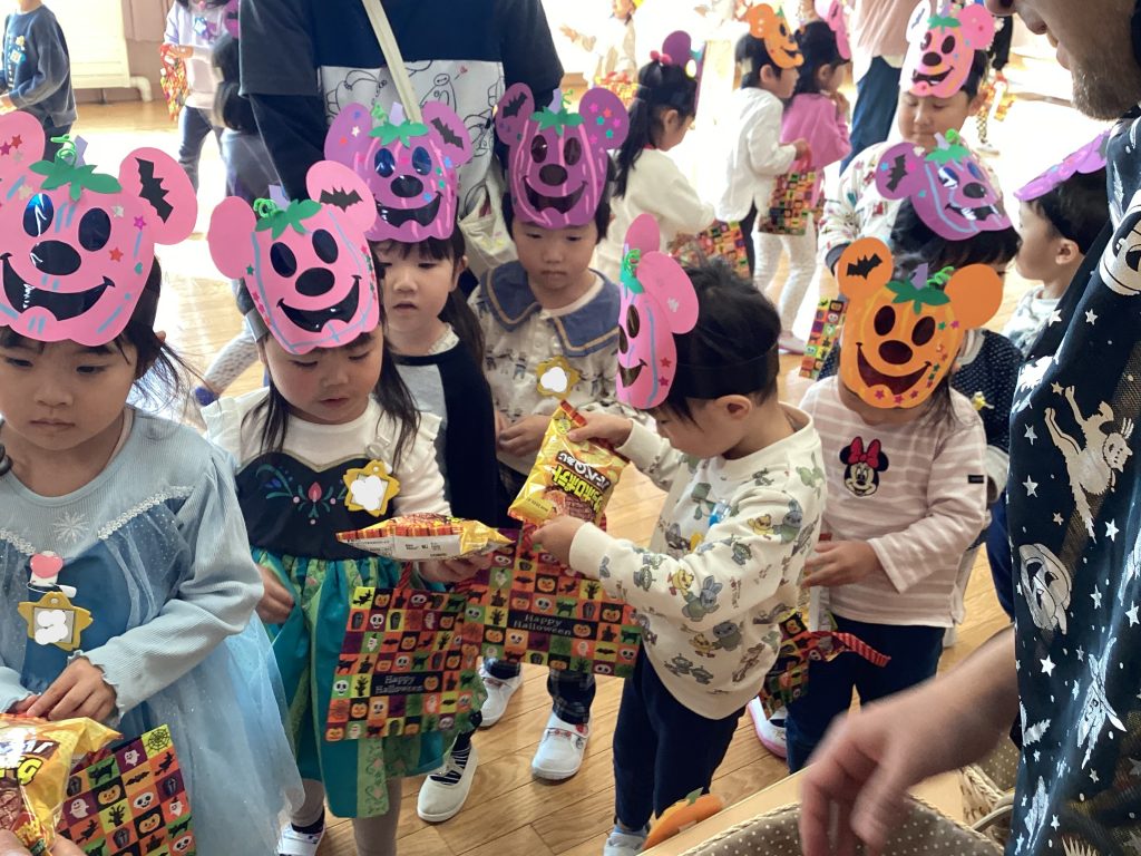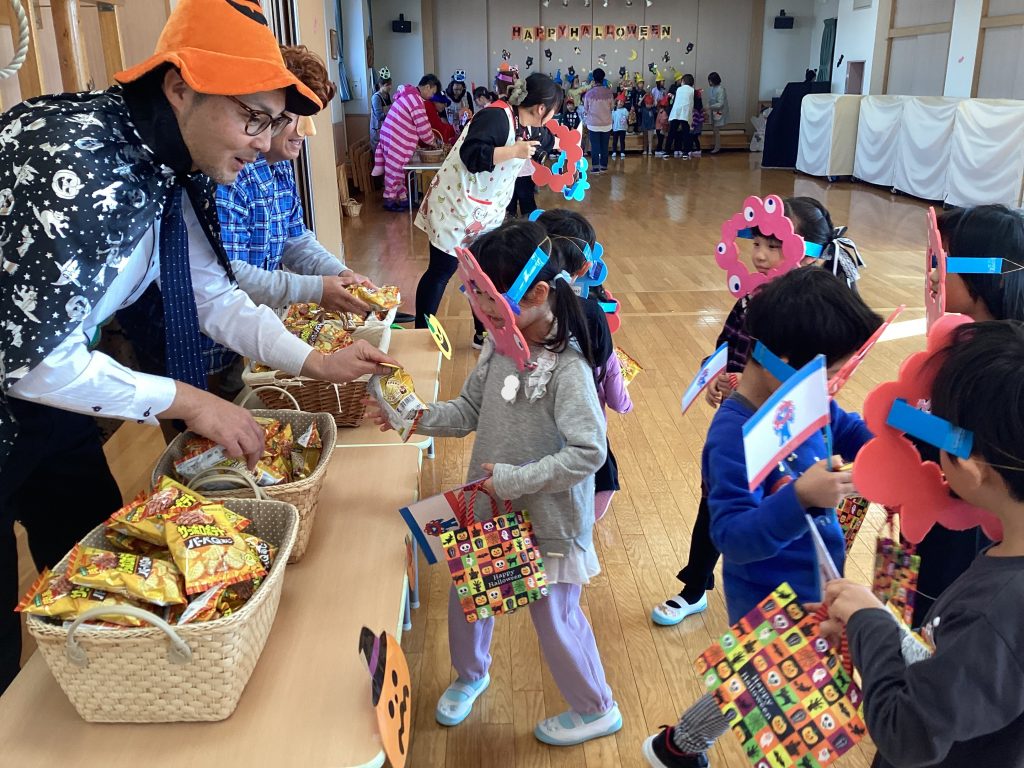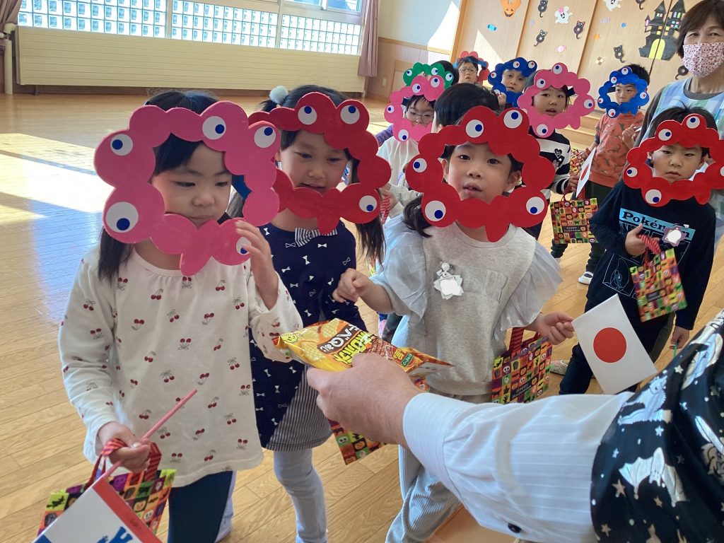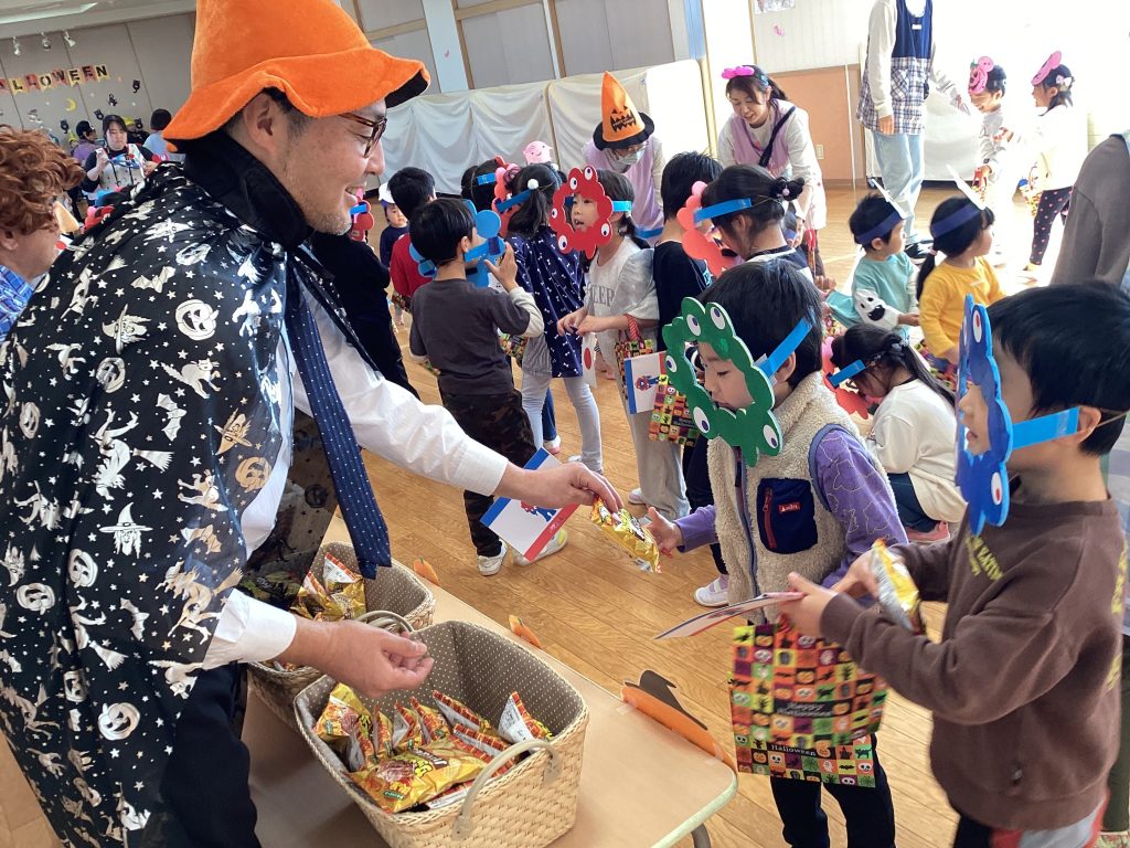 変装した子どもたちは、さっそく先生からお菓子をもらいます🍭