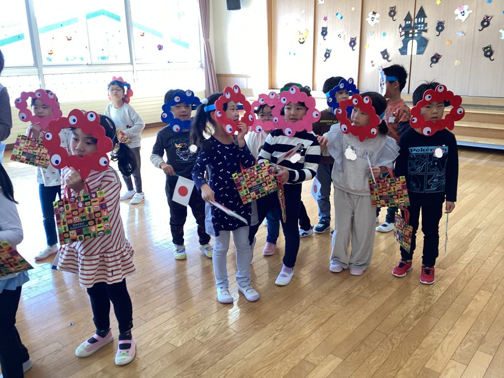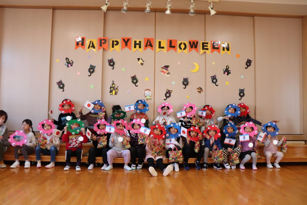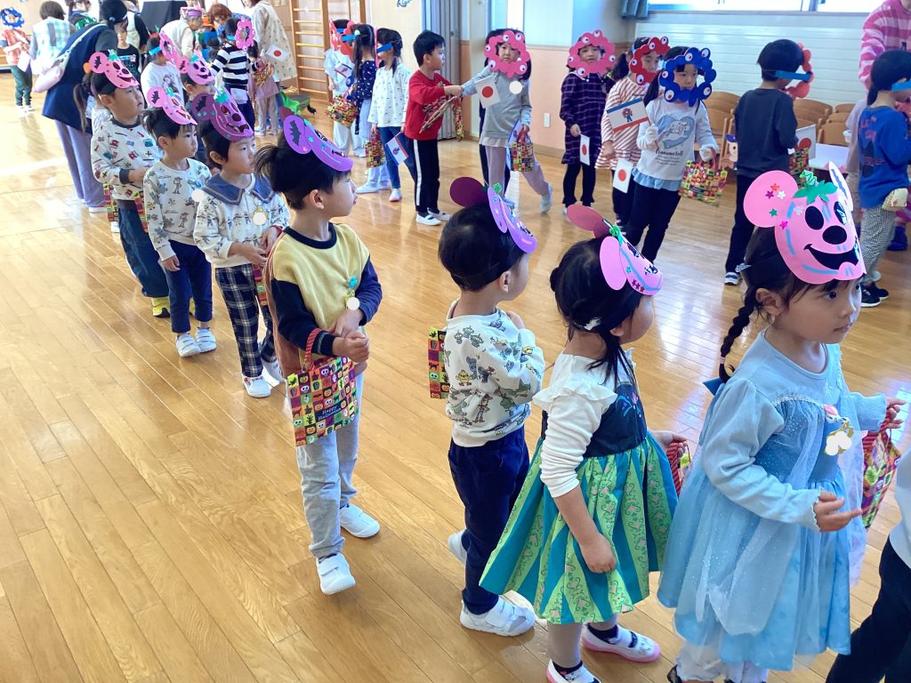 ゆり組は運動会の競技に使用したピクミン帽子に自分たちで作ったお花をつけて仮装しました🌸