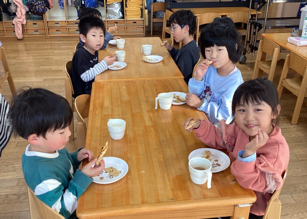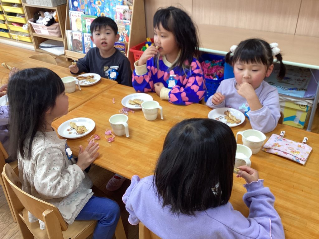 手作りおやつのパンプキンパイを子どもたちはおいしそうに食べていました。