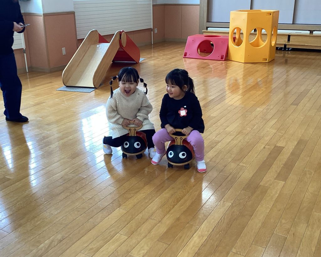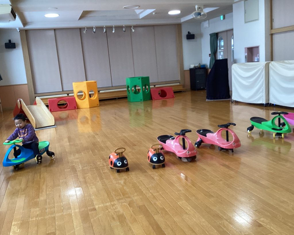 お遊戯室ではすべりだいやアスレチック、プラズマカーやてんとうむしに乗って広々遊べます。