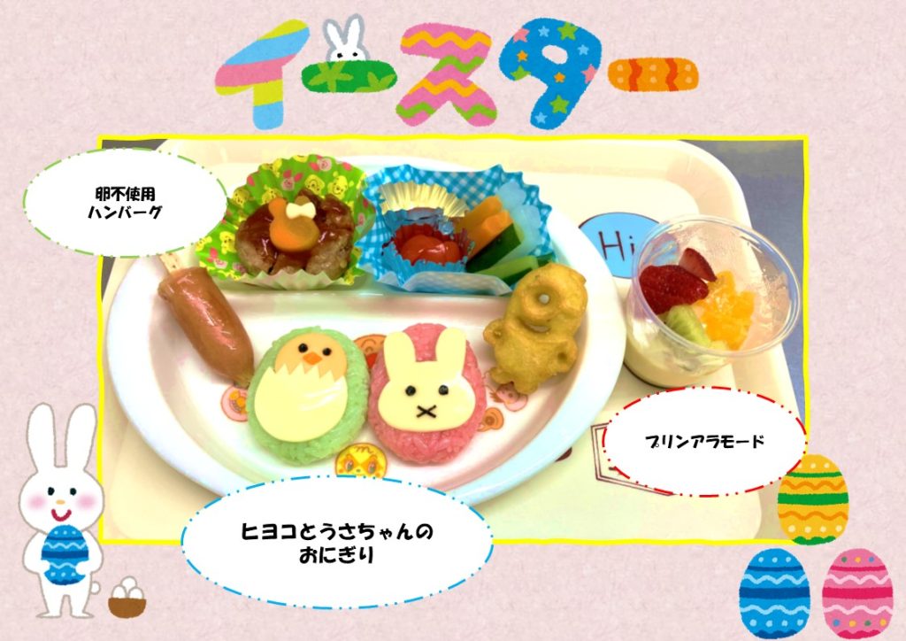 イースターは、イエス・キリストが十字架にかけられたあと、三日目に復活したことを祝う日です。 卵は、生命の象徴であり、うさぎは子孫繁栄と豊穣を象徴しています。 こどもにとってはかわいいひよことうさぎのおにぎりです。