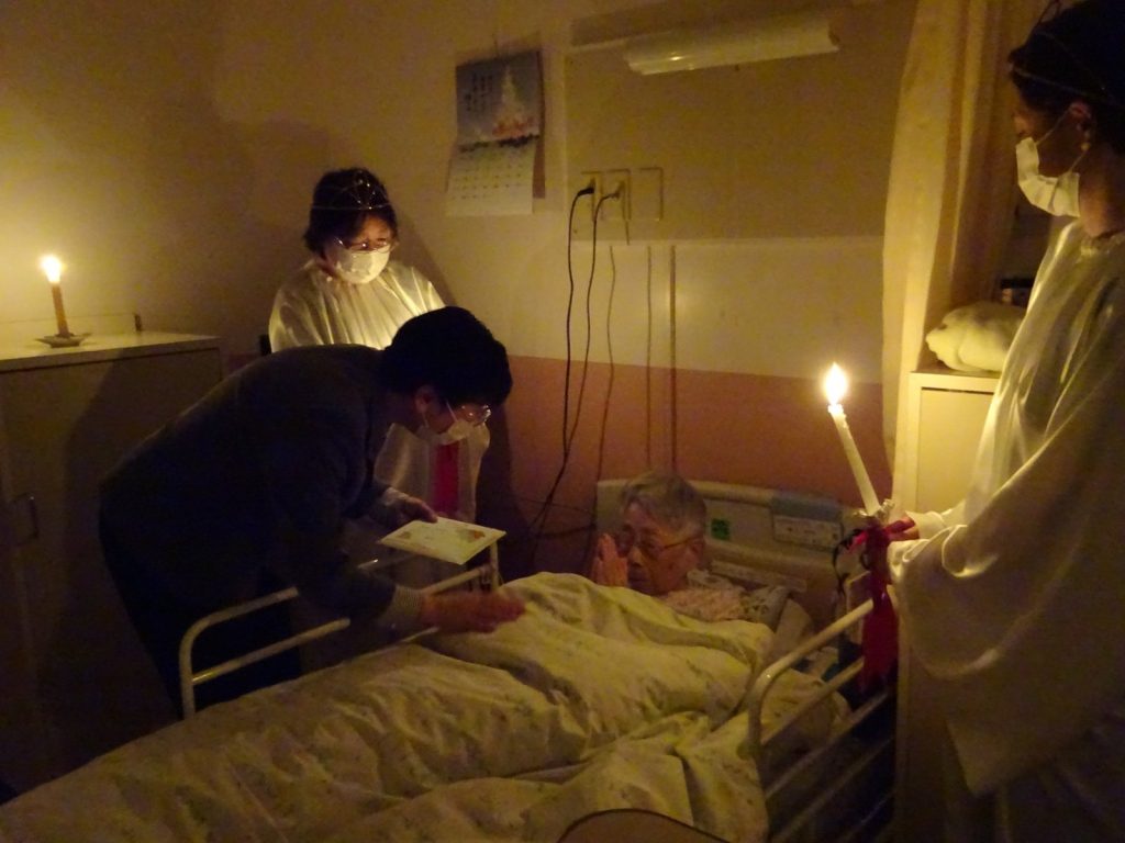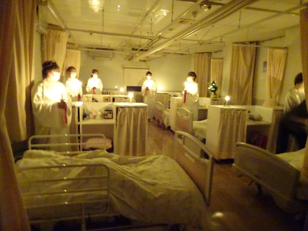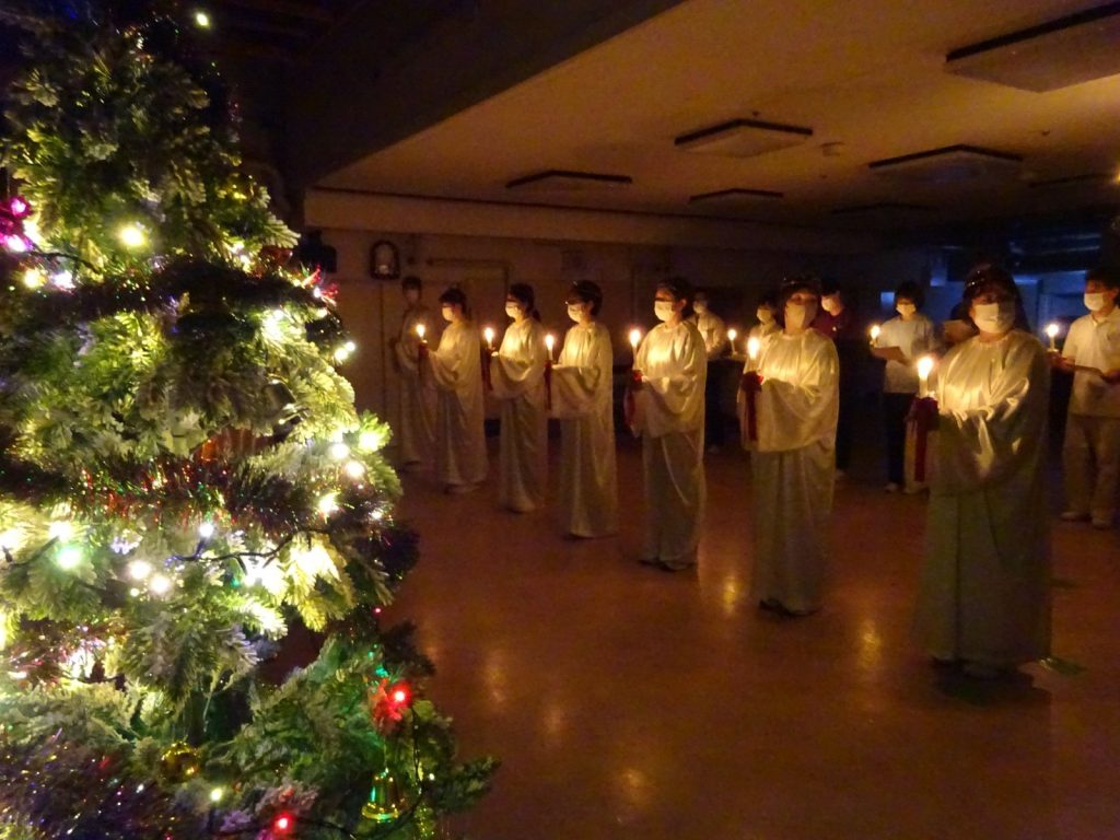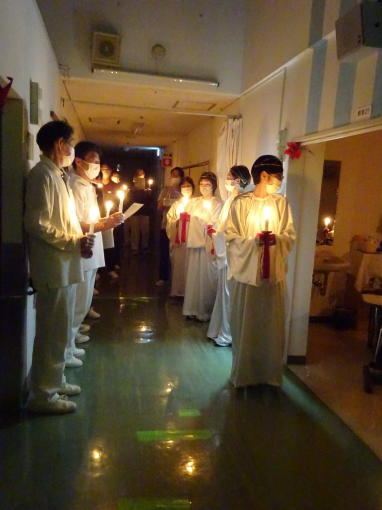 白いガウンに身を包んだ職員が、ろうそくを手に静かに列をつくり、賛美歌とともに歩みを進めていきます。