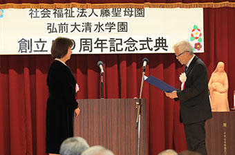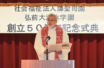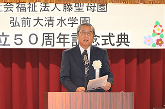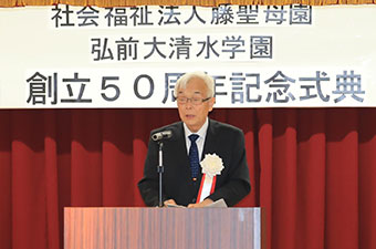 本日は、弘前市の桜田市長さんをはじめ、多くの御来賓の皆様のご臨席を賜わり、弘前大清水学園創立50周年記念式典をこのように盛大に開催できますことは喜びに堪えません。