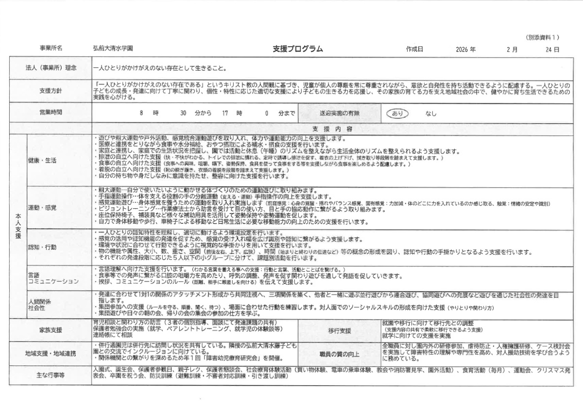| 13:00 | 自由遊び・午睡・クラス活動 | 降園・送迎 | ||||